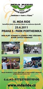 25.6.2011 od 11:00 hod. bude patřit Praha 5 v okolí parku Portheimka všem příznivcům a hostům akce 3. MDA RIDE. Motorkářům bez rozdílu značek a objemů a také všem, kteří se buď s námi na tomto dni podílejí nebo nám přejí a přijdou nás podpořit. Jedná se o fundraisingovou akci, jejímž cílem je konkrétní pomoc lidem s neléčitelným onemocněním svalovou dystrofií. Princip celé akce je postaven na setkání vozíčkářů, motorkářů a široké veřejnosti. Celý den bude koncipován jako velká zábavná show, s množstvím atrakcí a s vystoupením známých kapel. Hlavním bodem dne je benefiční vyjížďka motocyklů a jeepů, které se budou účastnit také děti s onemocněním svalovou dystrofií. Bližší info (foto/video) o této i minulých akcí na stránkách MDA RIDE: www.mdaride.cz Začátek: 11:00 Konec: 18:00 Kategorie: vyjížďky Kraj: praha web akce