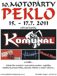 Pekelníci Vás zvou na jubilejní 10. ročník již tradičního moto srazu, který se koná 15. - 17.7. 2011 Zahrají kapely: Komunál, Horkýže Slíže revival, Venerat Priest (Judas Priest revival), Asacra, Revers rock a další... Jako vždy Vás čekají super soutěže, vyjížďka, spousta pití, jídla, erotiky a dobré zábavy. Více na:www.pekelnamotoparty.wz.cz Kategorie: srazy Kraj: královéhradecký web akce