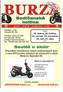 Tradiční Auto-moto-veterán Burza, občerstvení zajištěno , zpevněná plocha, celoroční soutěž o skútr.