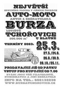 AUTO MOTO, ANTIK A SBĚRATELSKÁ BURZA TCHOŘOVICE U BLATNÉ. Všeobecná burza pořádaná na letišti Tchořovice u Blatné. GPS: 49°25'52.49"N, 13°47'58.59"E Zpevněná plocha o rozloze 300.000m se nachází cca 85km jižně od Prahy. Termíny 2023: 25.3., 27.5., 24.6., 26.8., 30.9., 28.10. a 25.11. Prodejci mohou přijet již v pátek! Kupující od 7:00-dříve nebudou vpuštěni! Od 27.5. bude od návštěvníků, kteří přijedou před 7:00 vybírán poplatek jako za prodejní místo! Přijďte prodat, co vám doma přebývá,nebo koupit, co ještě nemáte. Zváni jsou též numismatici, filatelisté, sběratelé odznaků, pohlednic a jiní... Občerstvení a toalety zajištěny. Srdečně zvou pořadatelé! Více na: www.burzatchorovice.cz tel. 602 132 238 burzatchorovice@centrum.cz Sledujte nás na Facebooku tam nejaktualněji zjistíte zda se burza opravdu koná: https://www.facebook.com/Burza.letiste.Tchorovice/ Chcete-li být pravidelně informováni o burzách a doprovodných akcích, kontaktujte nás: burzatchorovice@centrum.cz burzy Kategorie: burzy Kraj: jihočeský web akce
